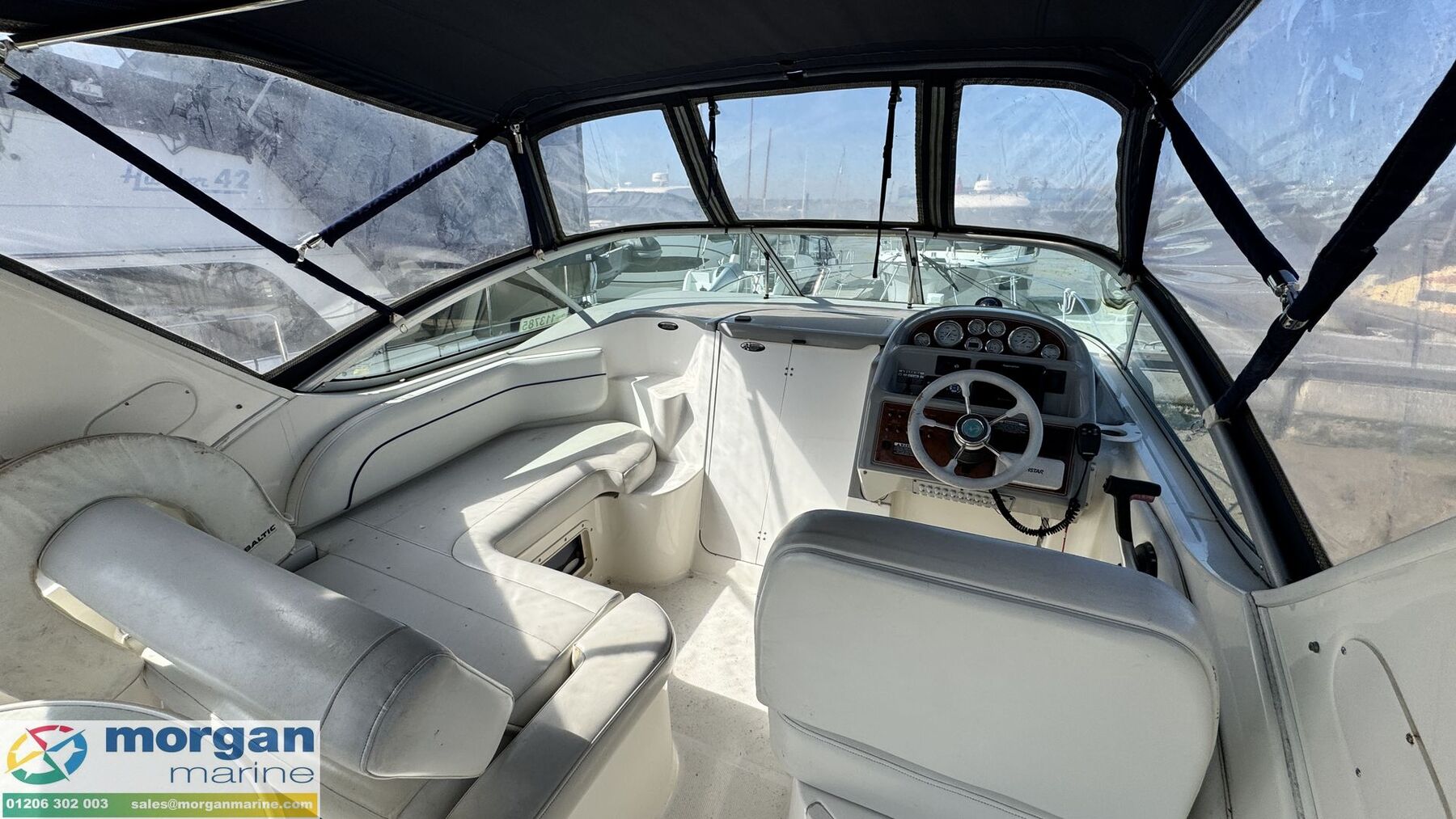 Cockpit: Large wrap around windscreen. Steps up to windscreen with walk through windscreen. Electric single windscreen wiper. Lift up hatch to saloon. Helm position to starboard side with engine controls, steering wheel and throttle controls. Danforth compass. Rear cockpit bench style cushioned seating with backrest. Cockpit port side L shaped sun lounger with flip backrest. Cockpit table. Lots of storage.