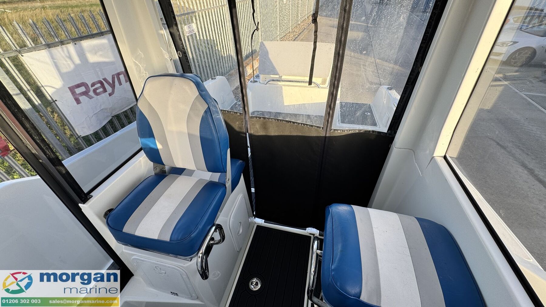 Cockpit: 360° visibility. Pilot seat with steering wheel and engine controls. Windscreen with electric windscreen wiper. Co pilot seat. Sliding wheelhouse door and canvass removable cover to open up deck-space. Opening roof hatch. Fishing edition – includes cockpit shower, deck washdown pump, live well, 5 Stainless Steel rod holders and cutting board on aft hatch cover. Bow and cockpit seating with removable cushions.