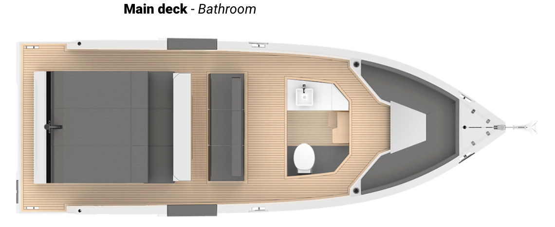 La coque est de couleur blanche. Le pont est recouvert de teck synthétique Flexiteek®, offrant une finition élégante et un entretien facilité. Un guindeau électrique avec ancre et chaîne permet un mouillage aisé. Une douchette d’eau douce est installée sur le pont pour plus de confort après la baignade. Le bateau est équipé d’un système de navigation Simrad avec écran de 7 pouces et d’un système audio Fusion RA55 avec quatre haut-parleurs. Pour faciliter l’amarrage, il dispose de taquets escamotables en aluminium. Il est également doté d’une table fixe à l’arrière et d’une table rétractable à l’avant. Une salle de bain complète avec WC électrique est incluse pour un confort optimal à bord.