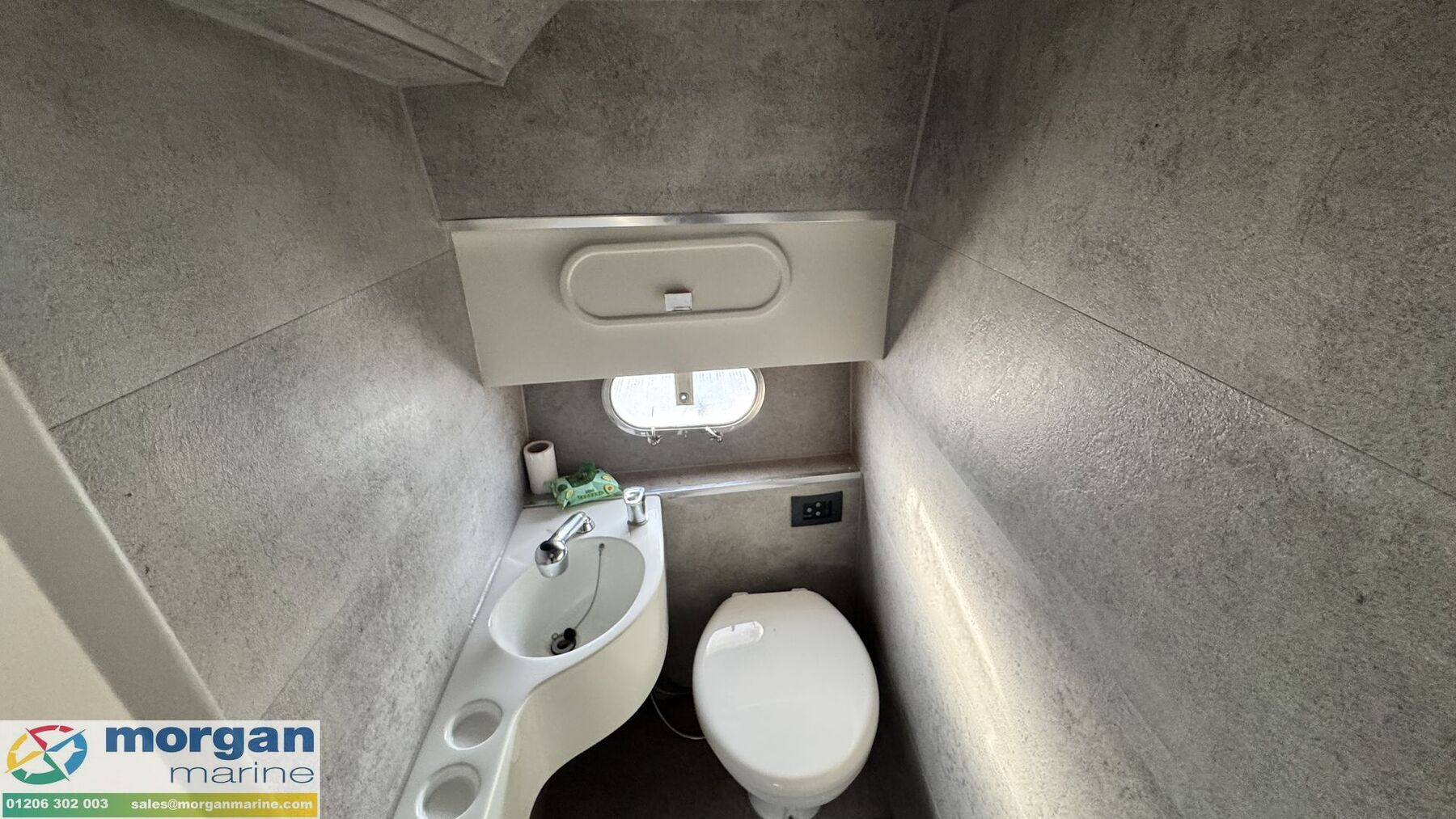 Cabin: Main forward V-berth with hatch. Starboard side aft double berth with storage and window. Toilet compartment with toilet, sink with shower and porthole. Galley with twin sinks, electric hob, oven, fridge, large amounts of storage and good amounts of worktop space. Forward U-shaped saloon cushioned seating. Steps down into saloon area. Good headroom. Stainless Steel ventilation grills.