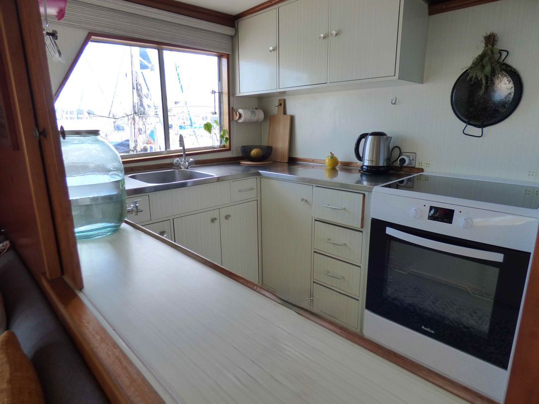 Cuisine vaste et bien équipée, avec accès coursive et passe-plat vers le carré