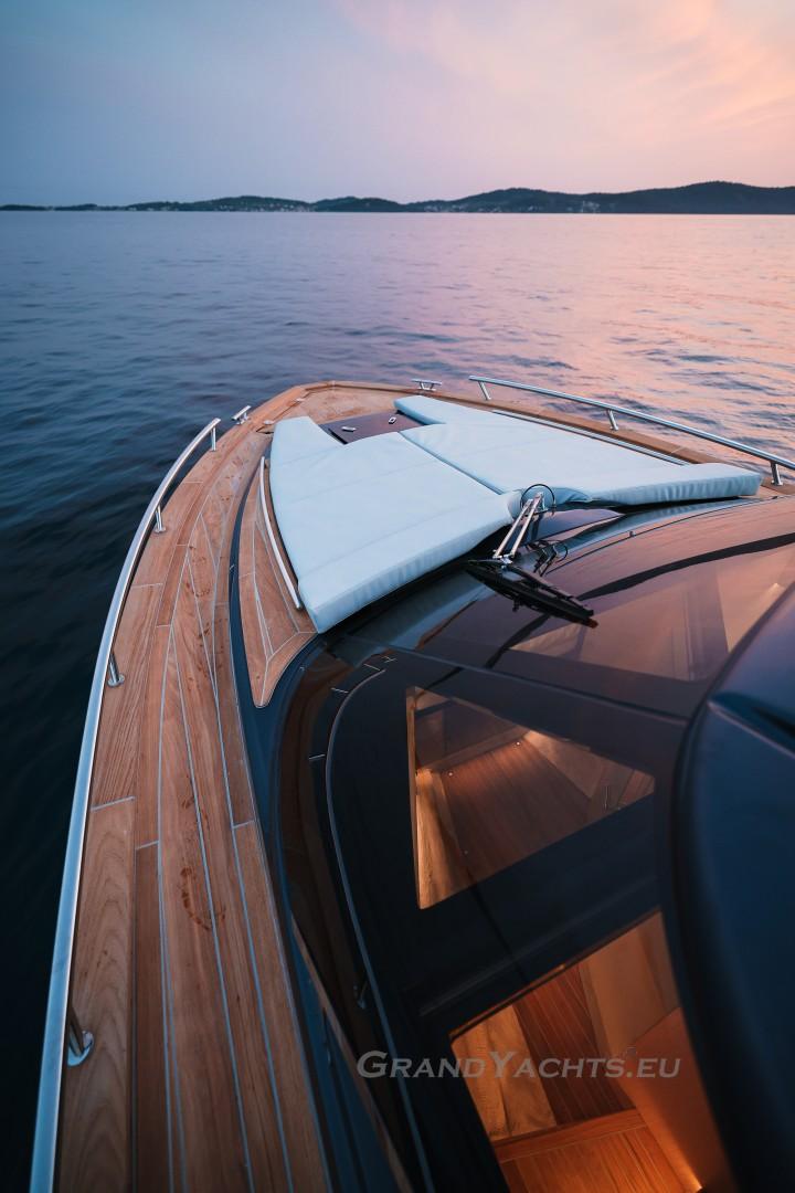 Cockpit Walking at level from the stern platform leads you into the large, open cockpit. You’ll immediately notice two major features: the first being an almost abnormal level of attention to detail and finish I like to call ‘The Focus Touch.’ The second thing is the strong spatial effect, mostly due to the unrestricted fore-and-aft movement and the wraparound hardtop screen, providing unrestricted vision anywhere in the cockpit. Directly aft is an extended sunbed both spacious and comfortable, an indispensable feature on any open sports cruiser. Take a couple more steps forward and you’ll be standing in front of a well-built wet bar which is nearly invisible in closed position. Lift the high-gloss kerrock counter to reveal a stainless steel sink and faucet, as well as an electric grill. The open-air galley also includes storage space, a compartment for litter and space for a wine-cooler. The aft side of the cockpit houses a six-man dining station with an adjustable wood-and-steel table. The sunpad area is stretches along the aft side, which, in conjunction with the non-rounded corners, provide the ultimate lounging experience. It's hard to talk about the cockpit without mentioning the helm. The console is raised compared to the rest of the cockpit, which is essential for good vision as well as being aesthetically pleasing. The vessel is operated from the centre of the three marine-grade, double stitched leather bucket seats, facilitating unimpaired movement for the observer. The solid teak sliding footrests are a very welcome addition, improving comfort while simultaneously being pleasing to the eye. The digital steering wheel is not only mesmerizingly beautiful, but adjustable as well to suit your preferences. The high-gloss, gel coated black dashboard is a dream come true for any captain, housing a bevy of state-of-the-art instruments. A raised panel below the compass contains all the digital engine gauges, as well as the alarm lights. Various waterproof switches are also present, as well as a 12 V USB socket. A rudder angle indicator and a Tridata (Depth / Speed / Trip) display are also standard equipment.