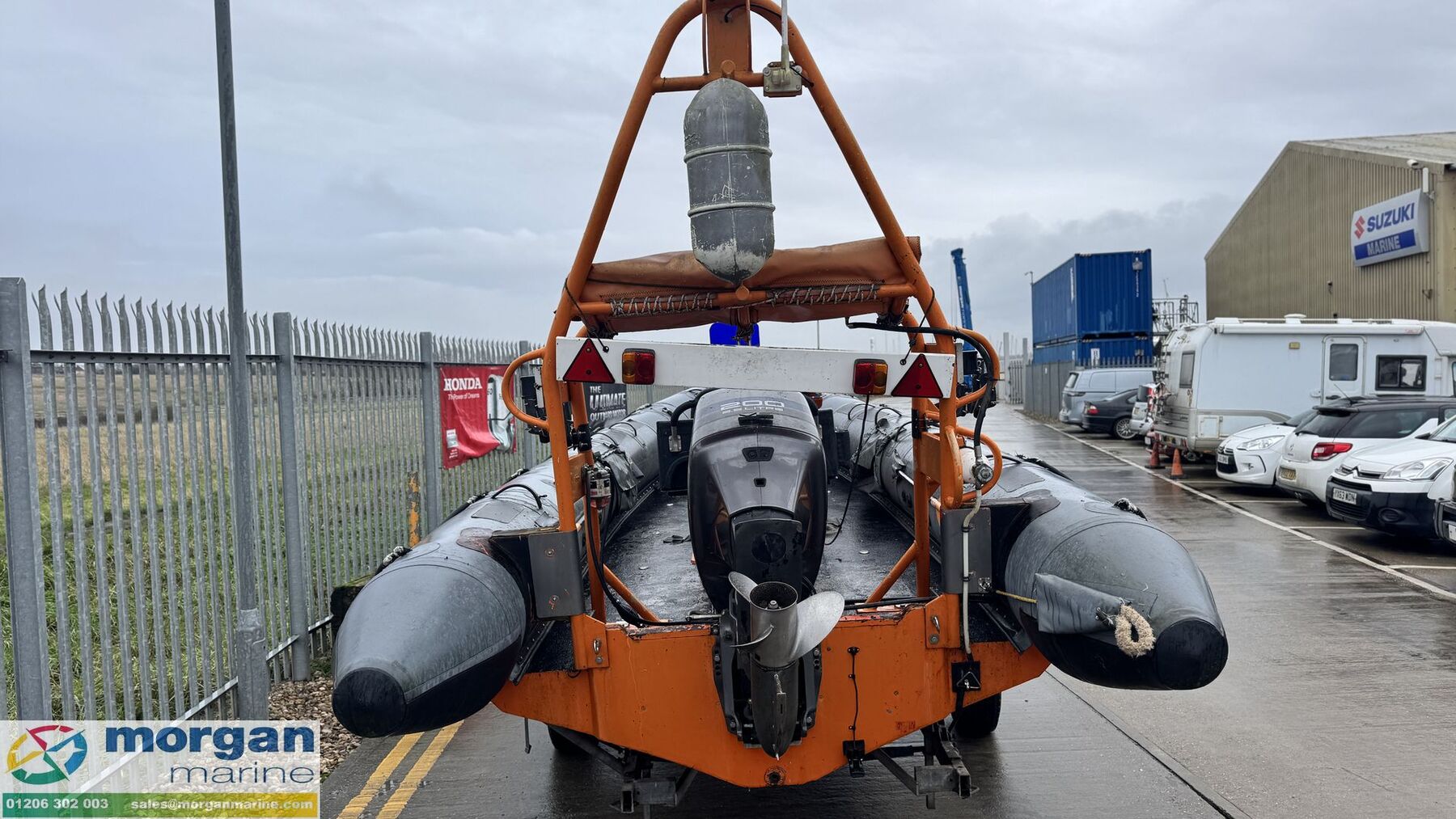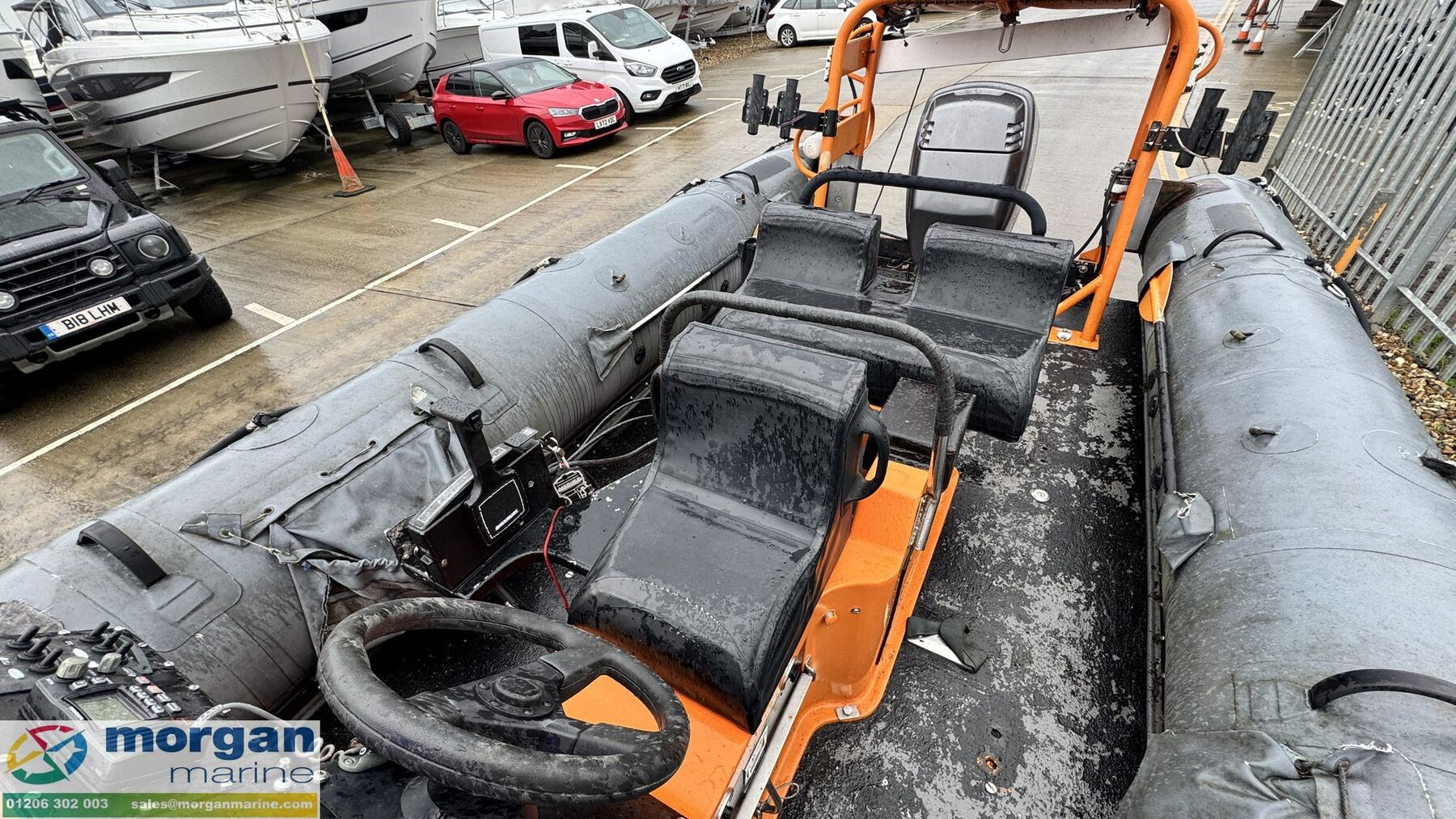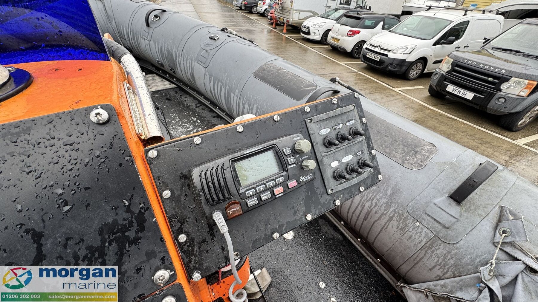 Deck: GRP orange hull with grey Hypalon tubes. Mooring cleats. Rope handles. Grab handles. A-frame. Manual windlass with anchor, chain and rope on front of console. Oars. Fishing rod holders.
