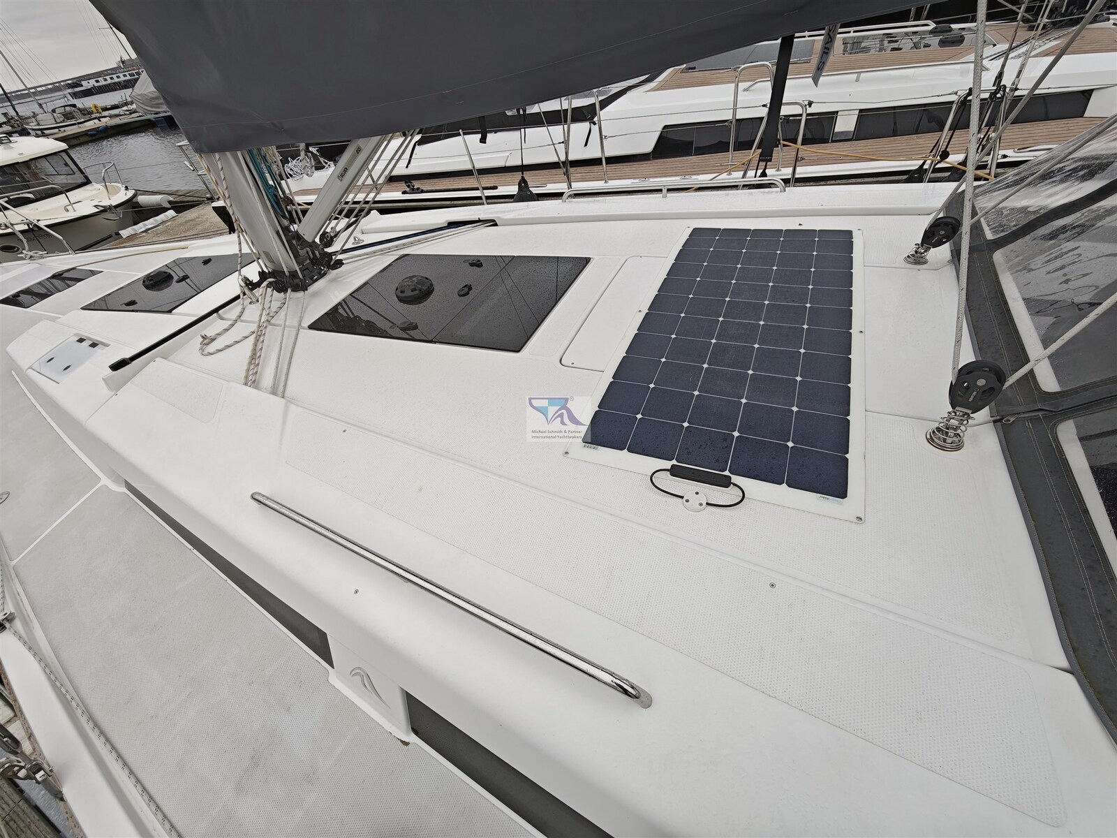 Anchor (Delta 16kg mit 30m galvanisierter Kette), Water pressure pump, 3 Batteries (je 160 Ah AGM), Deck Shower (warm/kalt), Twin Steering, Bow Thruster (12 V einziehbar inkl. Batterie), Solar panels (200 Watt), Platform (Badeplattform manuell mit Flexiteak), Teak Cockpit (Flexiteak, auch auf den Cockpitbänken), Shorepower connector, Electric Windlass (mit Fernbedienung und Ankerkettenzähler), swimming ladder, cockpit table (mit Staufach und Kühlschrank), 2 guard rails with gates, 2 Winch Electric (Lewmar 45 EST Evo Fallwinschen), Windex.