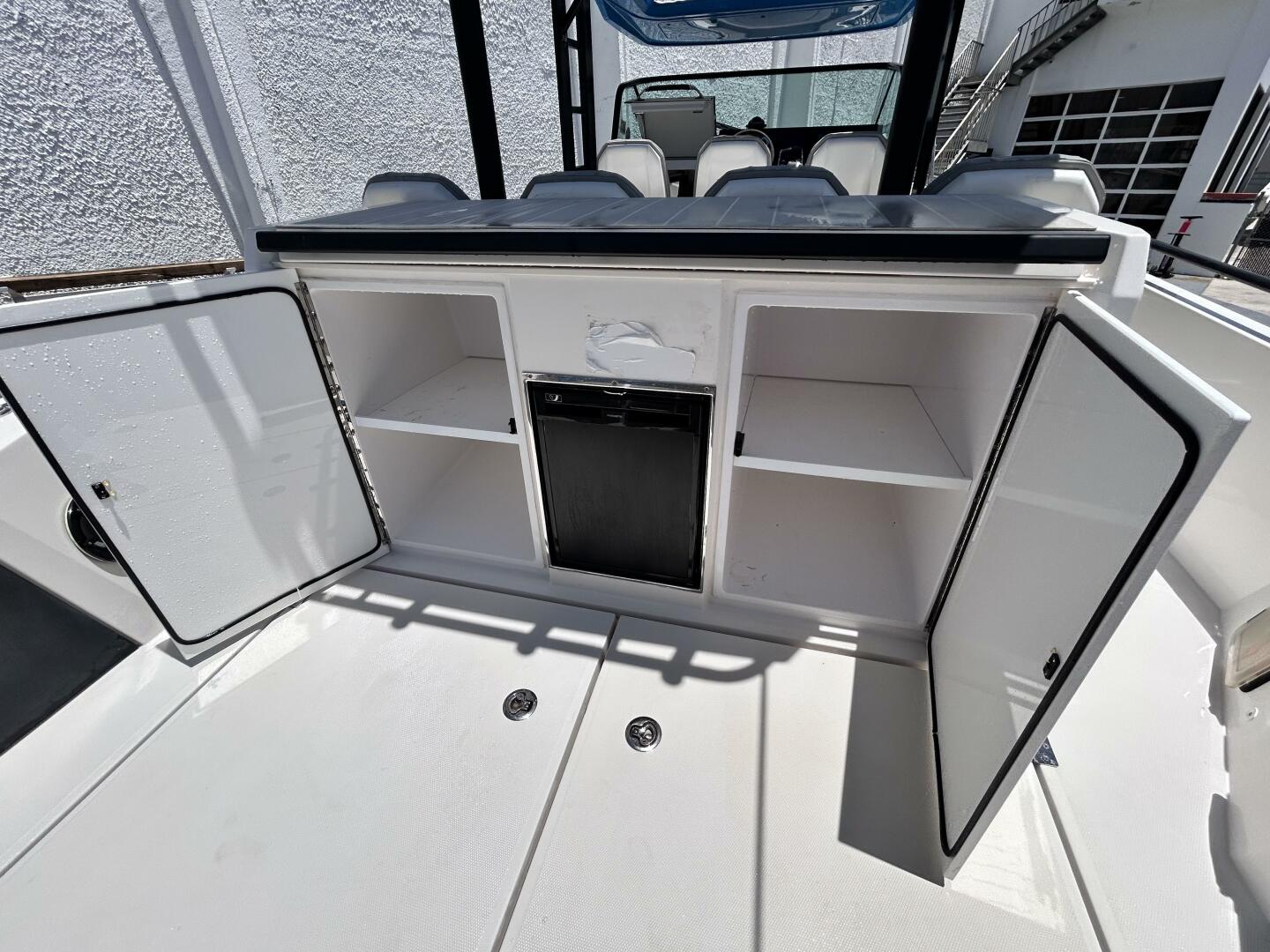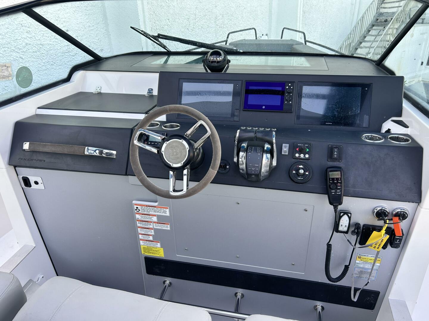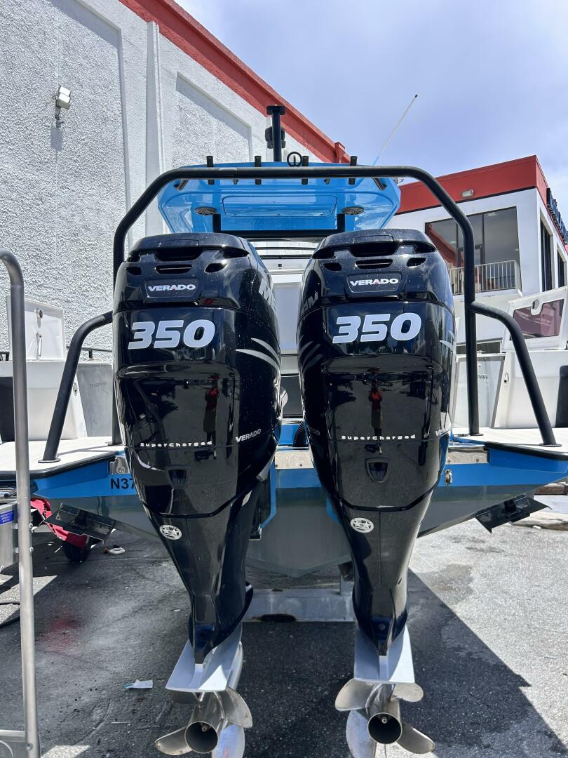 This vessel features the Brabus line trim package with Miami Blue hull color and the retractable Sunbrella canvas T-Top. Electronics include Garmin GPSMap 1222 Touch, Sonar Module Garmin with DownVu/SideVu, the Garmin VHF300i, and the upgraded Fusion Audio unit. Other notable features include 120V shore power, and bow thrusters.