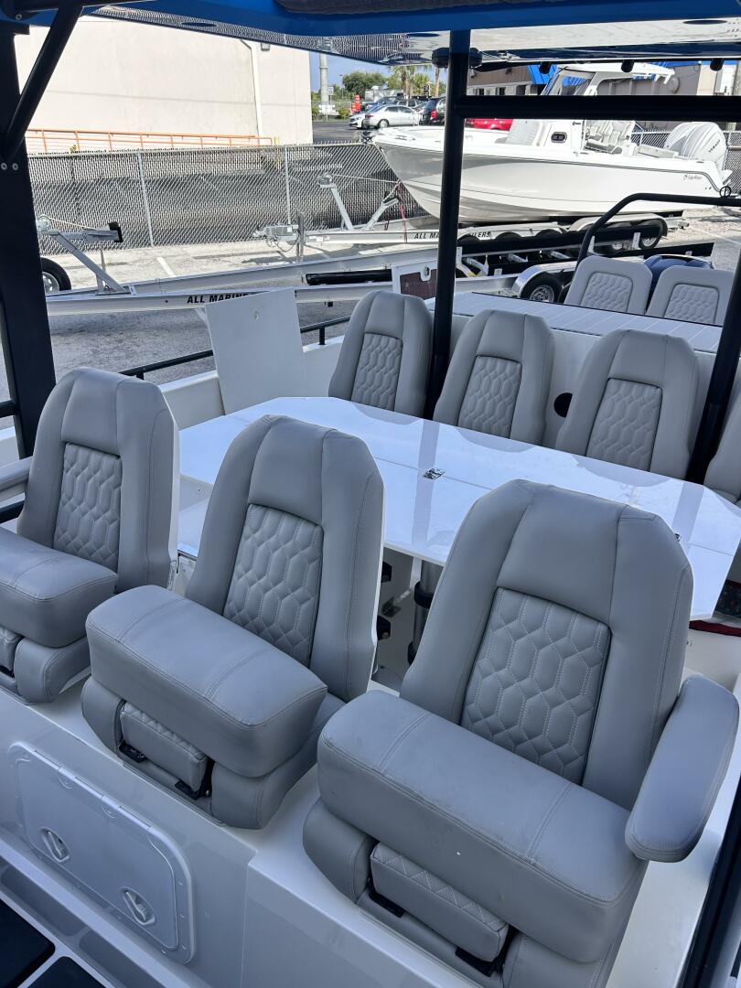 Seating includes a bow sun pad with additional bow cushions and a bow table, three seats at the helm with swivel function, four seats aft of the helm, and three transom seats, all in Silvertex Sterling. The helm seats swivel to face aft, creating a dinette area. The cockpit table can then lower to accommodate a filler cushion and create a berth for two, or fold to be out of the way. The bow lounge features a removable table for another dining and entertaining area.