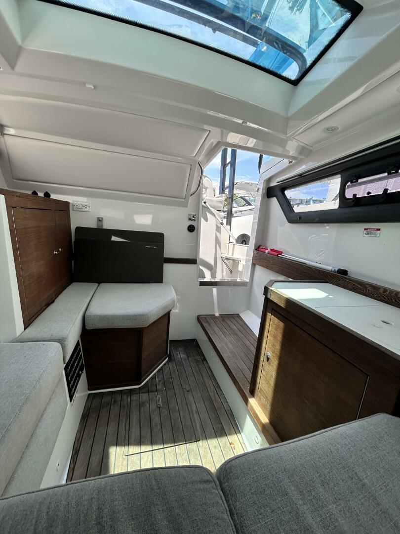 The forward cabin entryway is located at the helm. The cabin features a V-berth to accommodate two, a berth curtain, a bench seat, a sink with a cabinet, storage cabinets, courtesy lights, wood floor, blinds, and a toilet that is hidden by a folding cushion to create a bench seat.