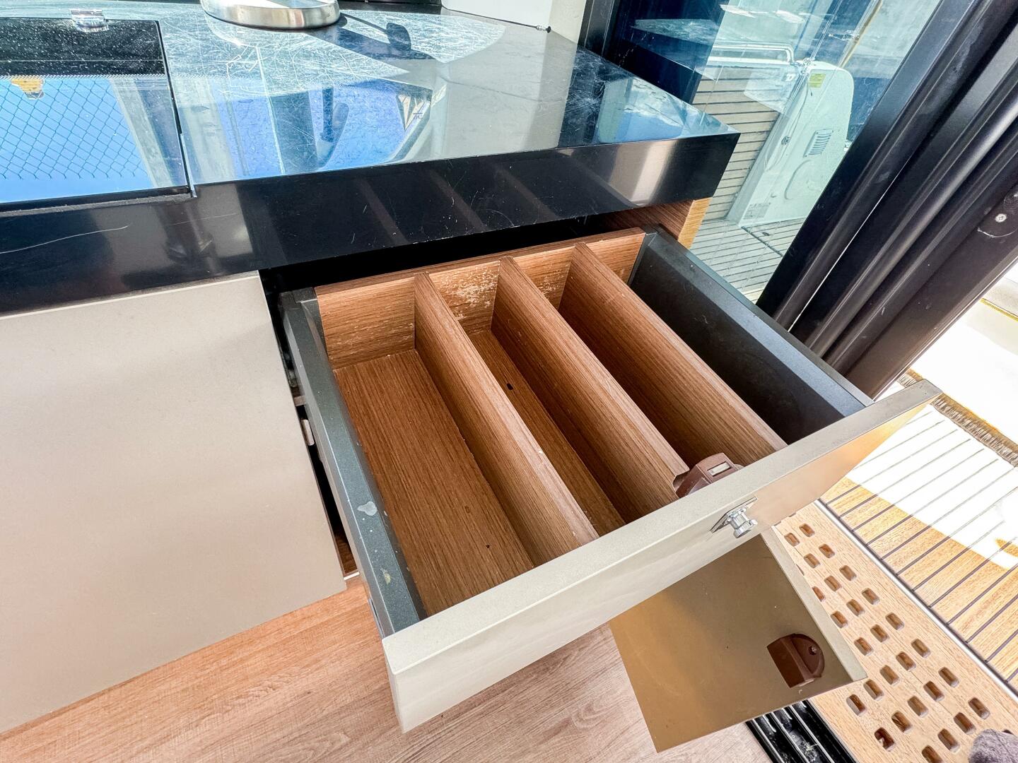 From the moment you enter the salon, you’re greeted with panoramic glass windows, a bright and modern interior, and finely appointed finishes that rival larger yachts. Below deck, two private cabins and an enclosed head offer generous overnight accommodations, while the expansive cockpit and forward sun lounge create multiple spaces for relaxation and entertaining.