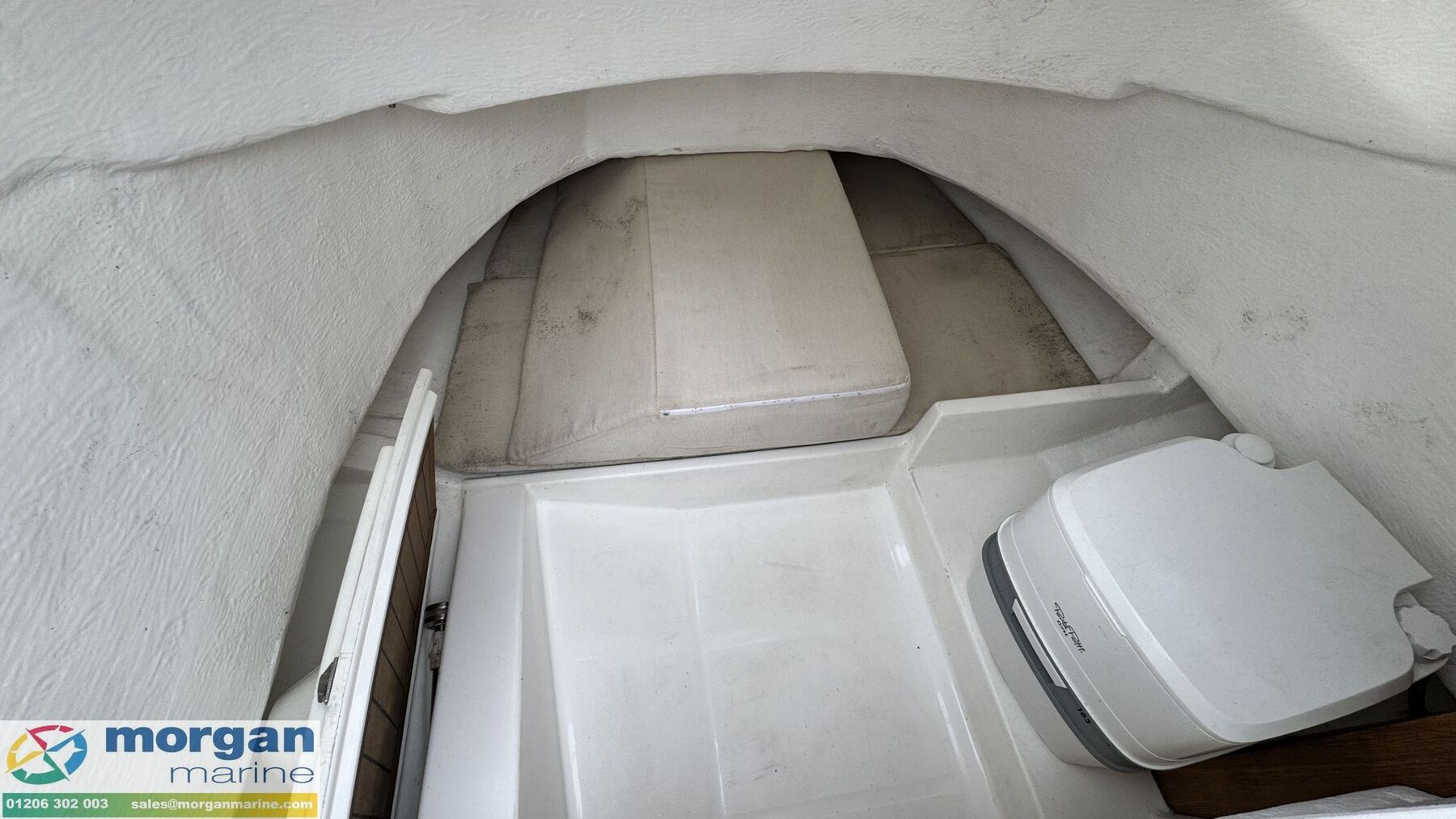 Cabin: 2 berth cuddy area with infill cushion. Chemical toilet.