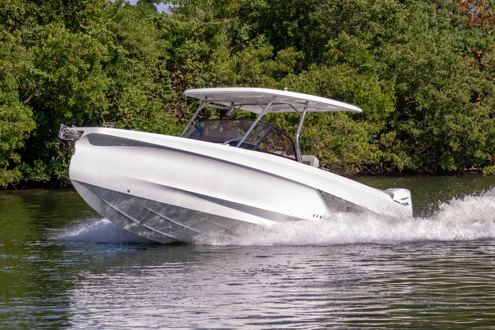 The progressive hull of every STERK is optimized for maximum speed and agile handling. Extensive CFD testing ensures safe, precise control. The double-stepped, deep-V hull with strategically placed spray rails increases lift and reduces spray. A new and unique feature is the hook rails at the stern, which, along with negative chines, provide superior grip, reduced heeling, and high cornering stability—a STERK signature.