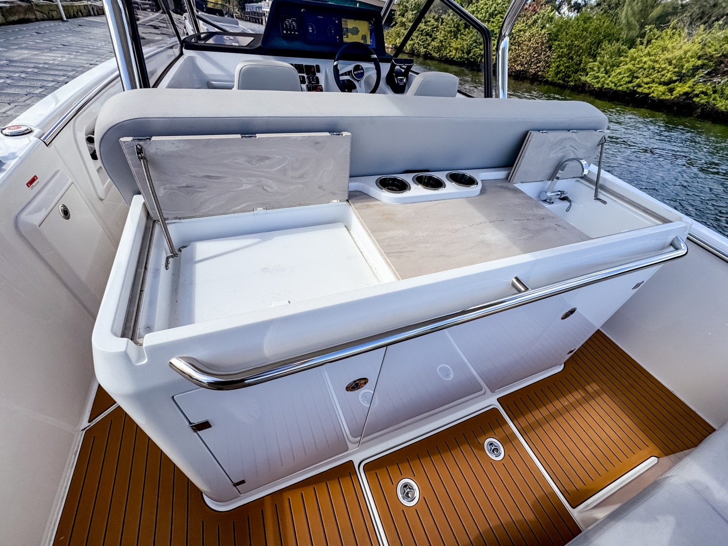 • Large aft platform and generous storage space in lockers under the bar and seating.
