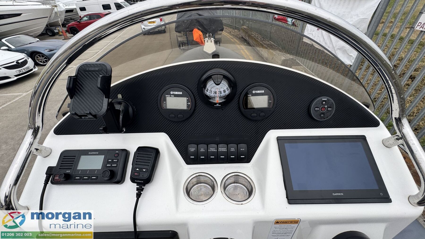 Electronics: Garmin chart plotter. Fusion audio system with speakers. Garmin VHF radio. Yamaha digital gauges (speed, fuel and tach). Compass. Navigation lights. Anchor light. Deck lights. Automatic and manual bilge pump. Isolator switch.
