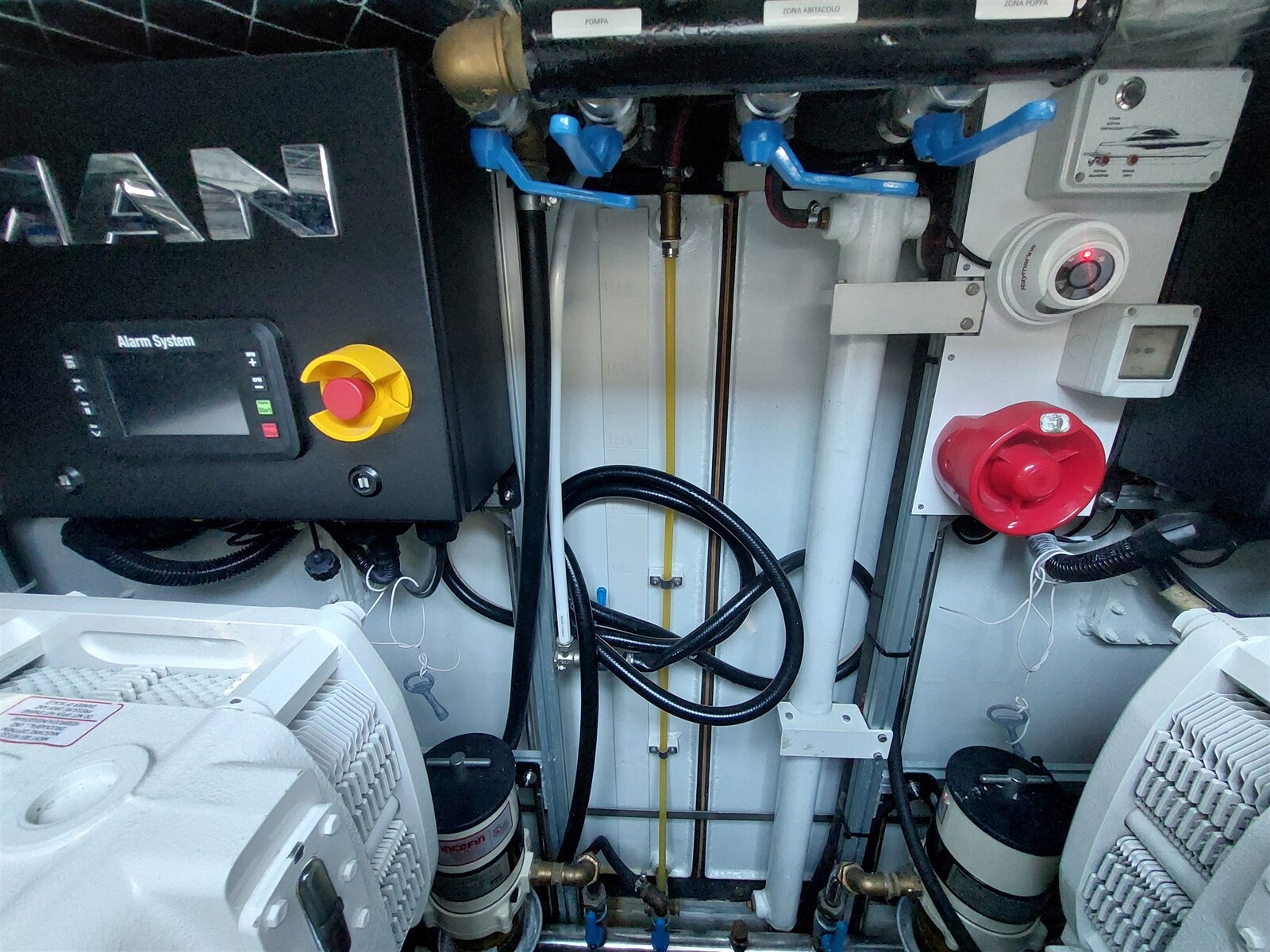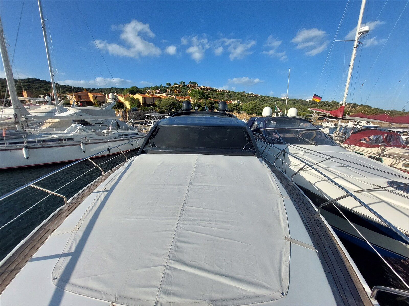 Gas Alarm, 2 Motoralarm, Bilgealarm, Wechselstromgenerator, Druckwasserpumpe, Batterien (New 2025), Teak auf Laufdecks, Batterieladegerät (Victrom), Landstromkabel, Reling, Cockpitdusche, Suchscheinwerfer, 2 Trimmklappen hydraulisch, Hardtop, 2 Trimmklappen Anzeigen, Ketten-Waschanlage, Waschbecken im Cockpit, Nachtbeleuchtung, Unterwasserbeleuchtung, Außenbordmotor für Beiboot, 6 Fender, Gangway (Opacmare eletroidraulica a scomparsa), Plattform, Abwassertank-Abflusspumpe, 4 automatische Bilgepumpe, Teakdeck, Eingangstür, Teak im Cockpit, Landanschluß, Wasseranschluss, elektrische Ankerwinde, Badeleiter, Cockpittisch, Beiboot (2.20), Signalhorn, T-Top, Verholwinde auf dem Achterdeck, Verholwinde auf dem Vordeck.