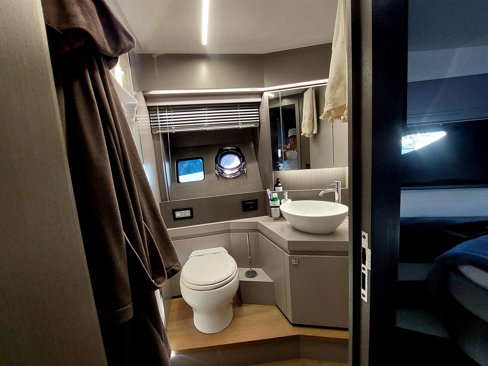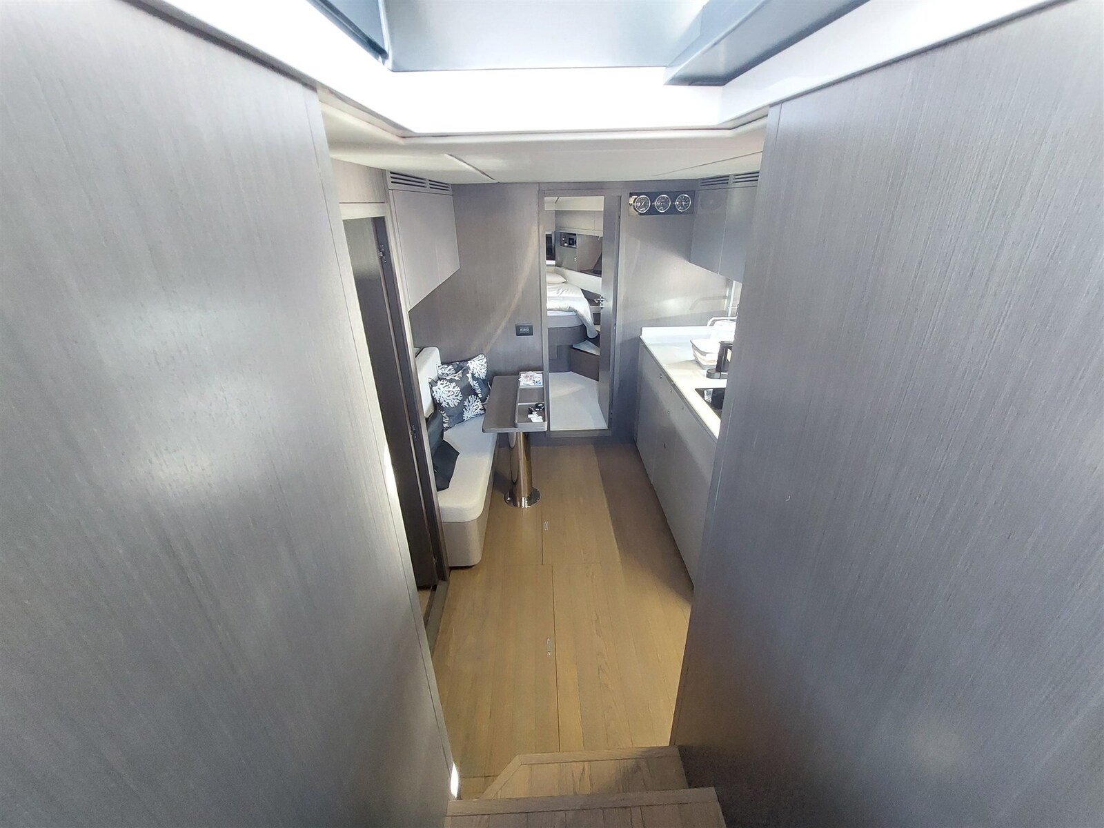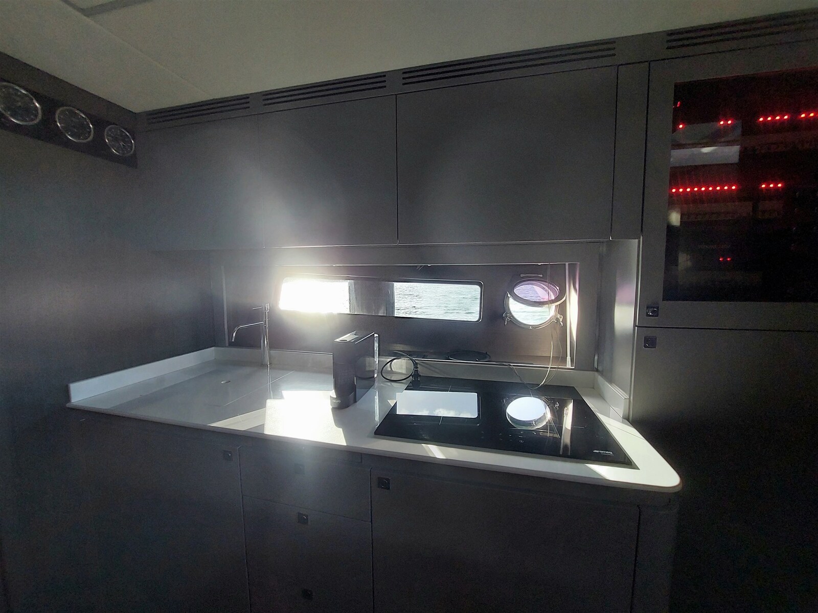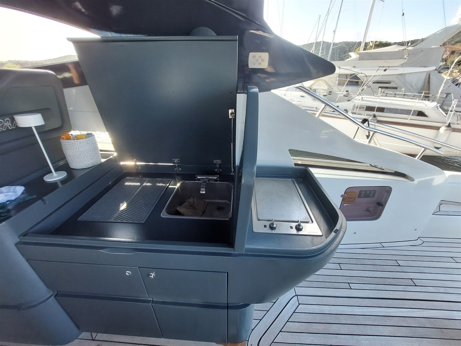 Pantry, Kühlschrank an Deck, Eisbox, Eiswürfelbereiter, Spülmaschine, Mikrowelle (Combi), Elektrische Kochplatte.