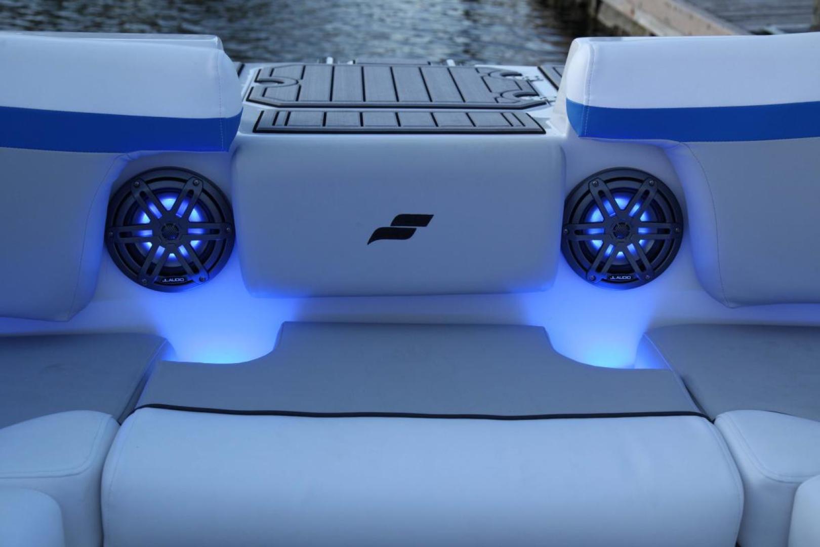 Other features includes cognac upholstery, brown bow & stern platform mats, tan extended swim platform mat, ten cupholders, Audio pluss 225 package, cooper table, pressurized water system, upgrade color package, boarding ladder, black rub rail, black swim platform, transom shower, docking lights, ski pylon, engine house dual battery system, brown marine mat, and rear speakers with remote.