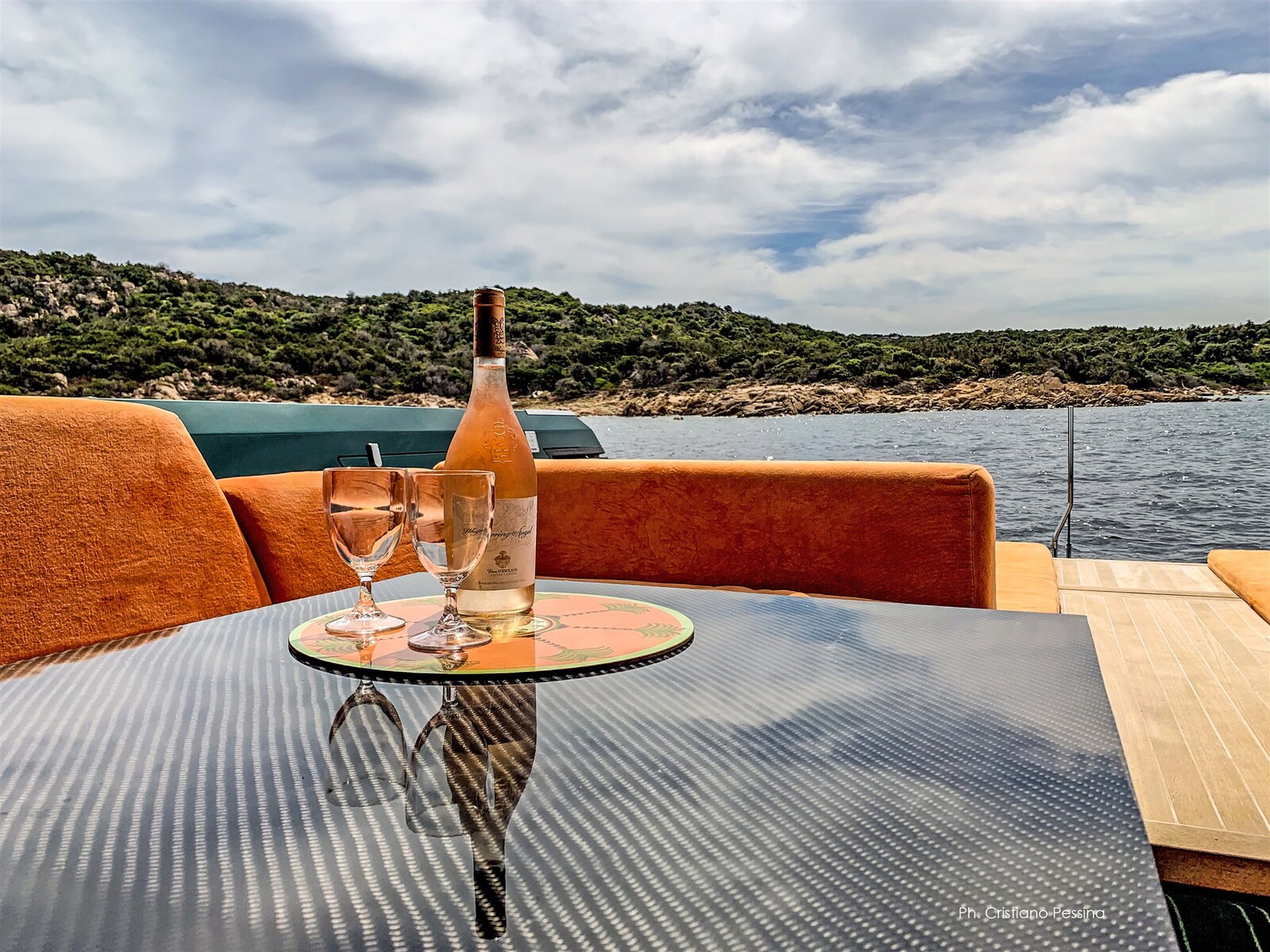 2 Engine Alarm, Bilge Alarm, Alternator, Water pressure pump, Teak Side Decks, Shore power cable, Special Colour (metallic green), Deck Shower, Directional Spotlight, Electric Flaps (2023), Hard top, Fire Extinguishing System, Washbasin in the cockpit, Courtesy Lights, Gangway (Transformer Besenzoni), Platform, 3 Automatic Bilge Pump, Teak deck, Entry door, Teak Cockpit, Shorepower connector, Voltage Rectifier, Electric Windlass, 2 swimming ladder (elettroidraulica ed in carbonio), cockpit table, Horn, Bow Winches.