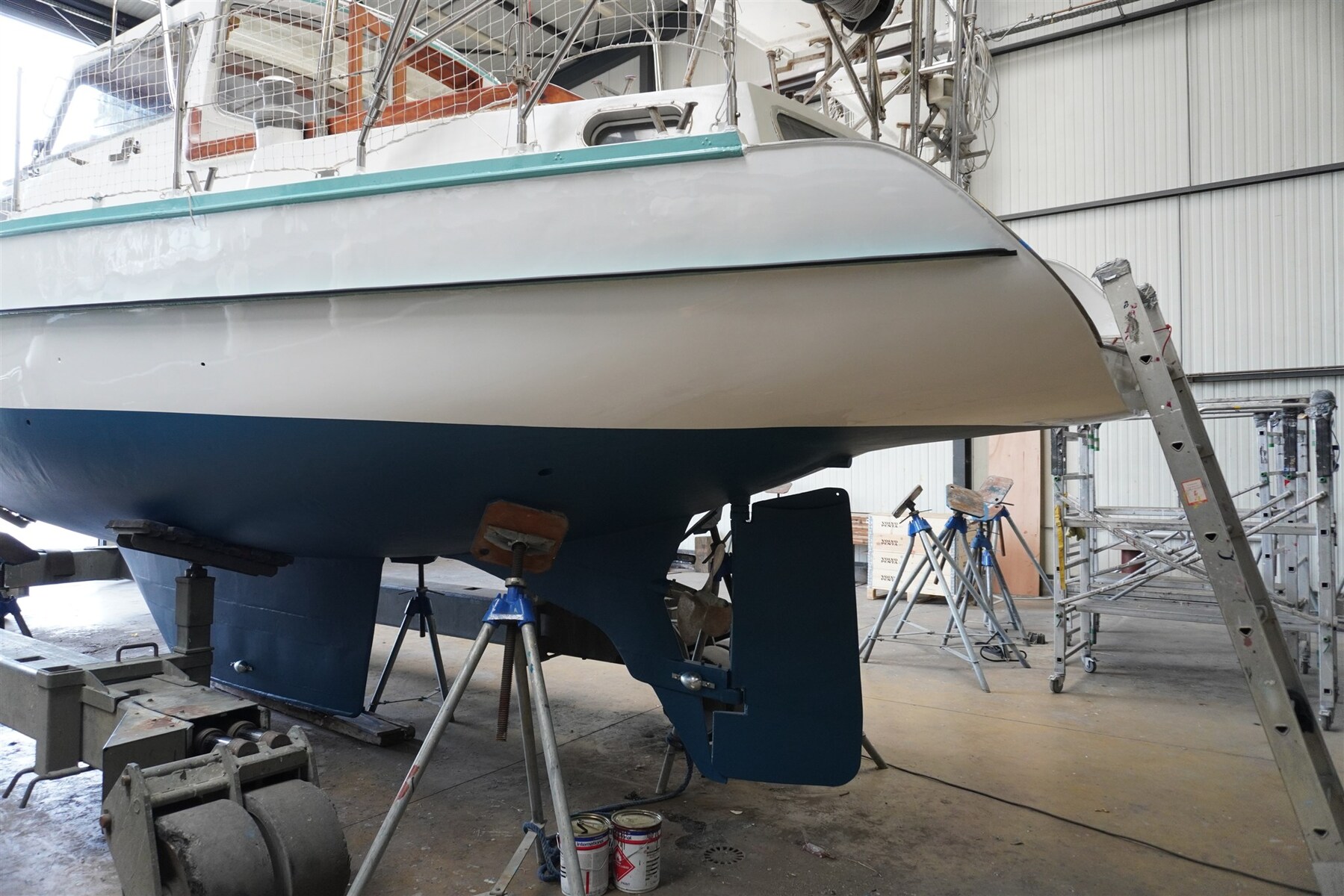The boat in 2023 was refitted in a French shipyard incl. exterior painting.