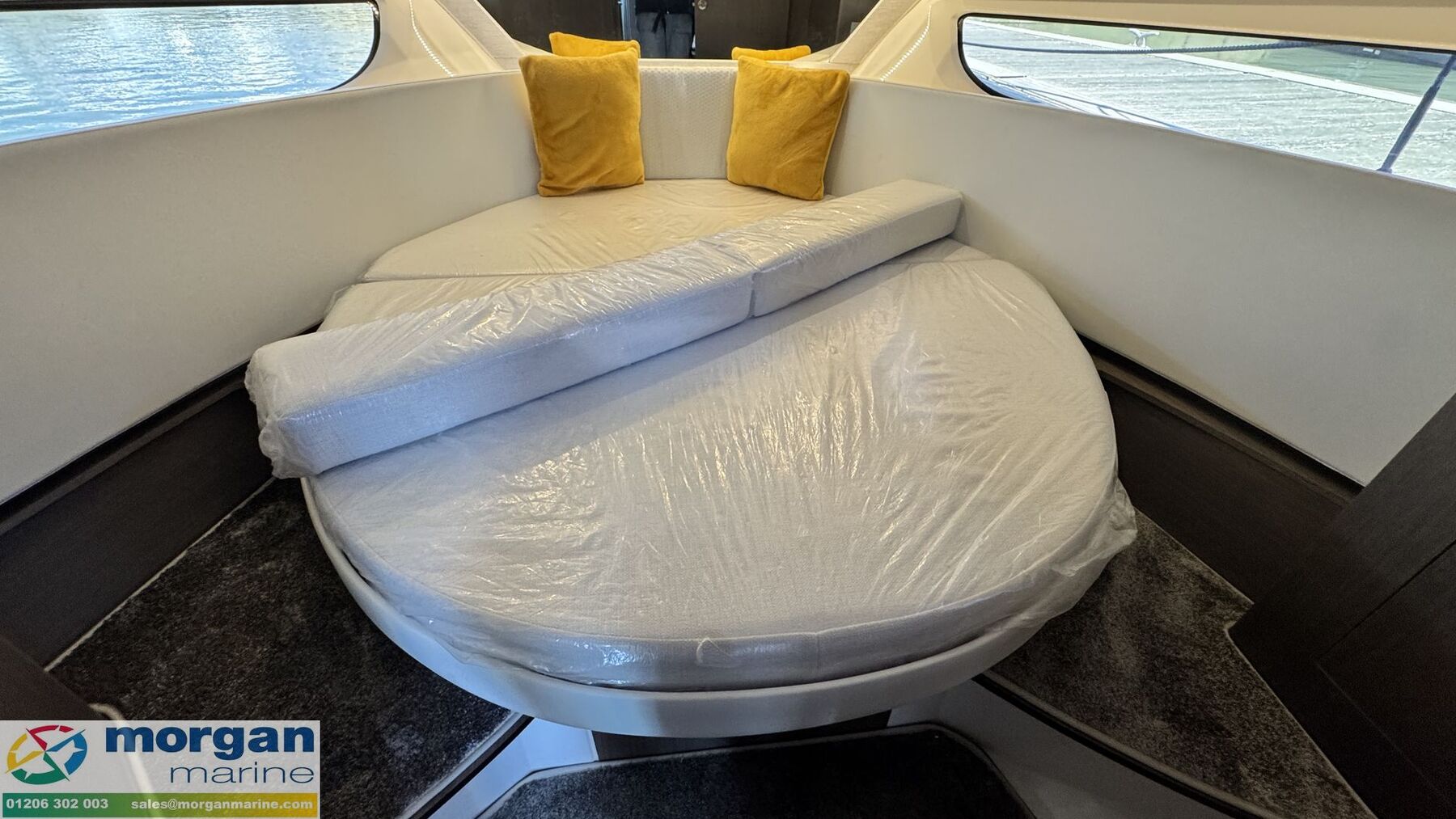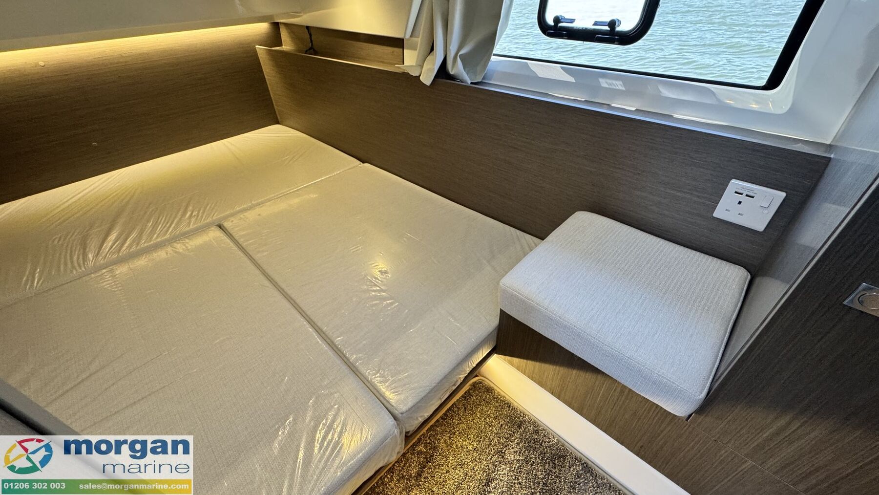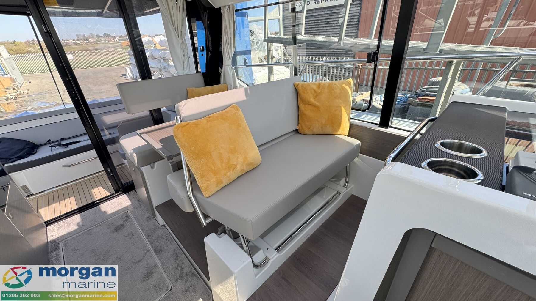 Cockpit: Wheelhouse with aft sliding door, 2x roof hatches, sliding door on starboard side (for easy access to side deck) and sliding window on port side. Large glass windscreen with port and starboard windscreen wipers + screen wash. Helm position with large bolster pilot seat, dash with full engine controls, electronics and compass. Port side saloon with table, lockers under seats and LED lighting. Co-pilot bench converts to saloon seating. Starboard side galley with electric pressurised hot water, 80L fridge (12v), overhead lockers, marine microwave and gas stove. Wheelhouse curtains. Leatherette dolce artesian upholstery in saloon.