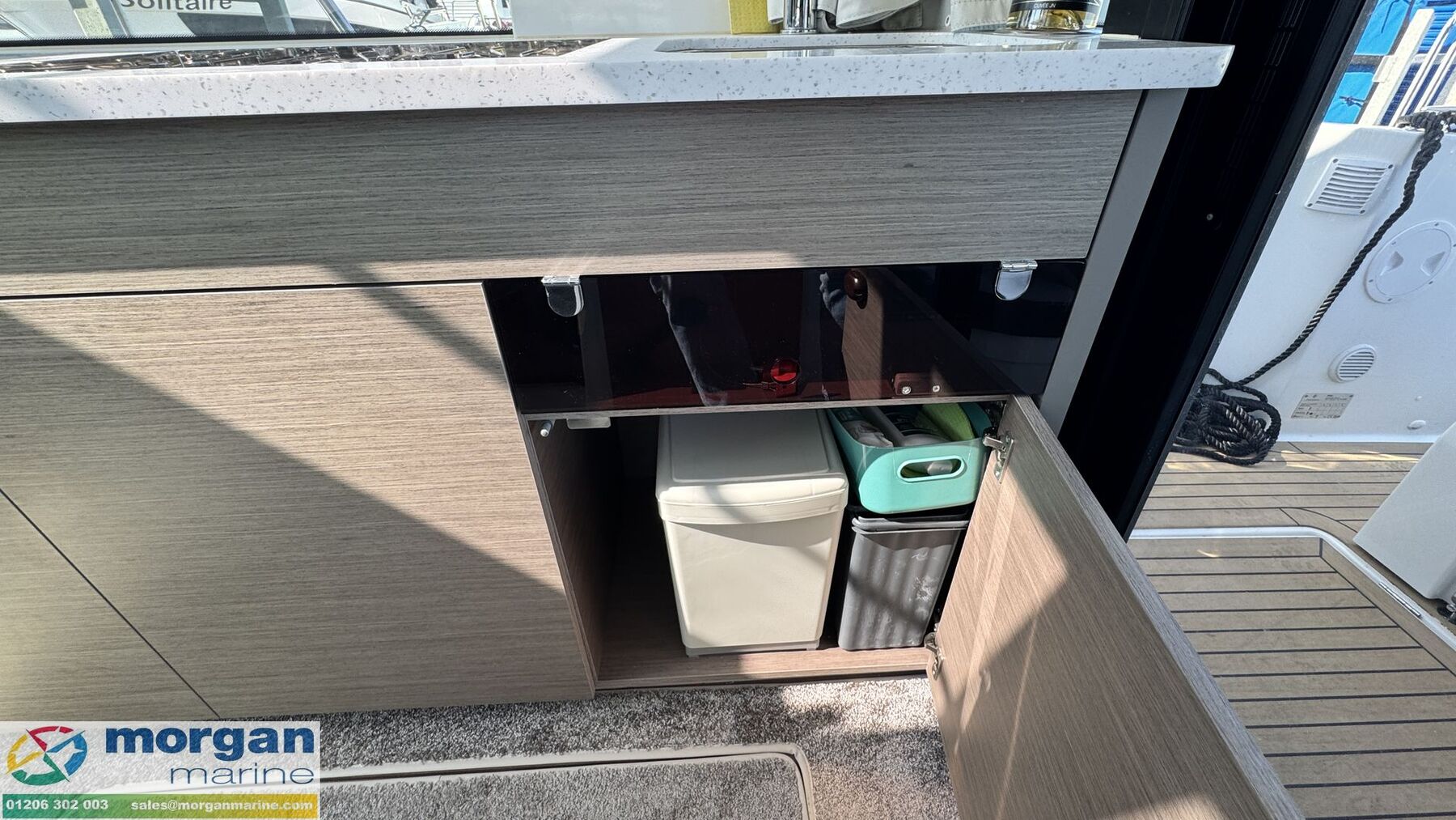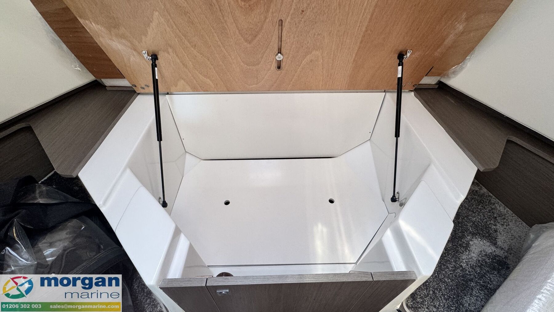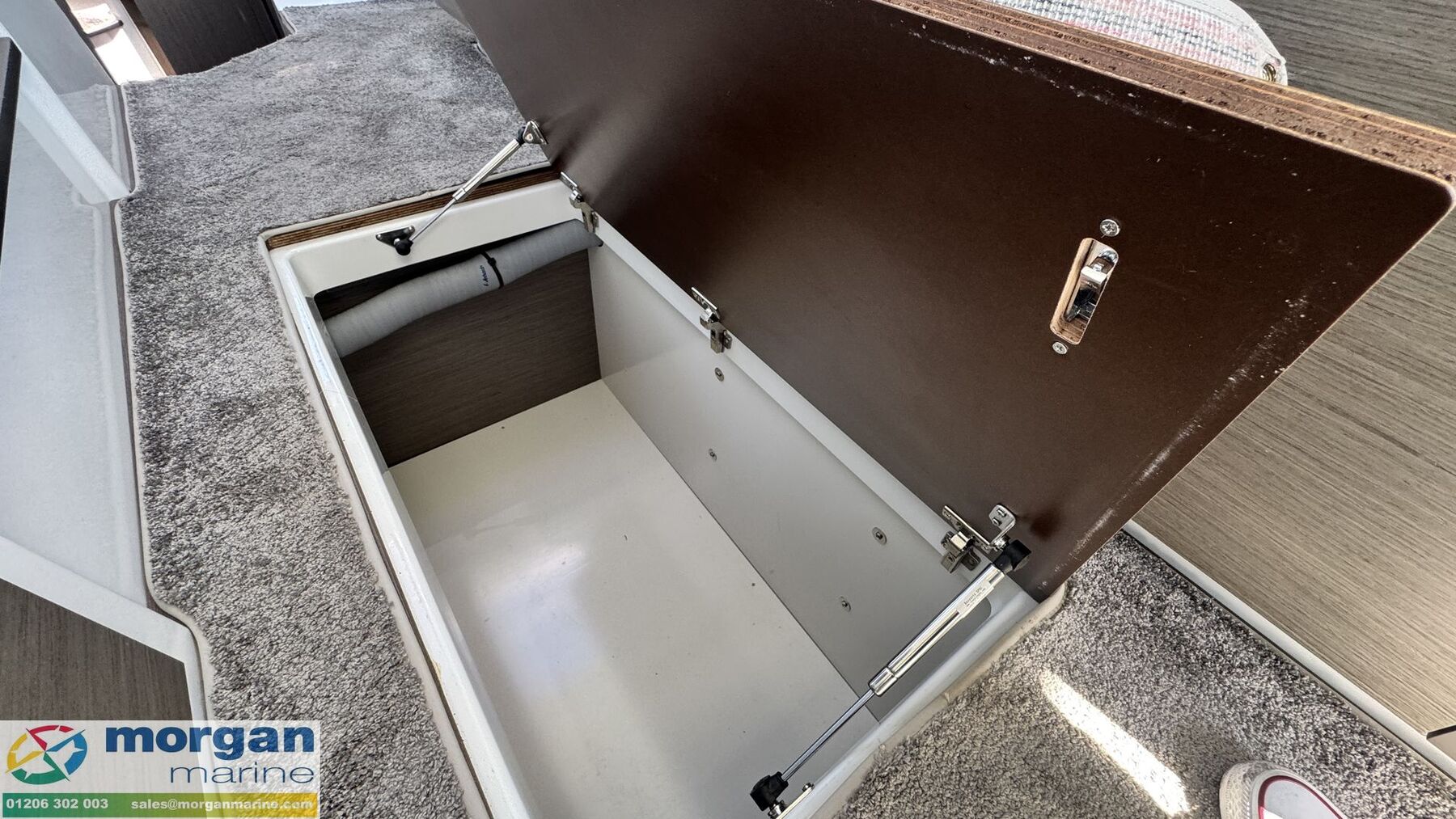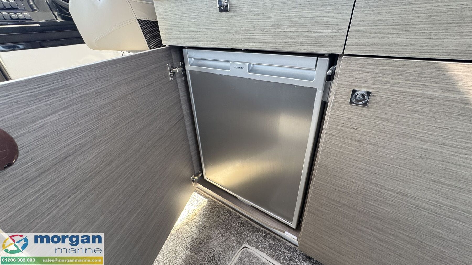 Cockpit: Wheelhouse with aft sliding door, 2x roof hatches, sliding door on starboard side (for easy access to side deck) and sliding window on port side. Large glass windscreen with port and starboard windscreen wipers + screen wash. Helm position with large bolster pilot seat, dash with full engine controls, electronics and compass. Port side saloon with table, lockers under seats and LED lighting. Co-pilot bench converts to saloon seating. Starboard side galley with electric pressurised hot water, 80L fridge (12v), overhead lockers, marine microwave and gas stove. Wheelhouse curtains. Leatherette dolce artesian upholstery in saloon.