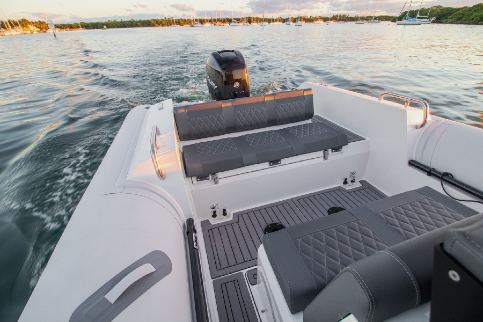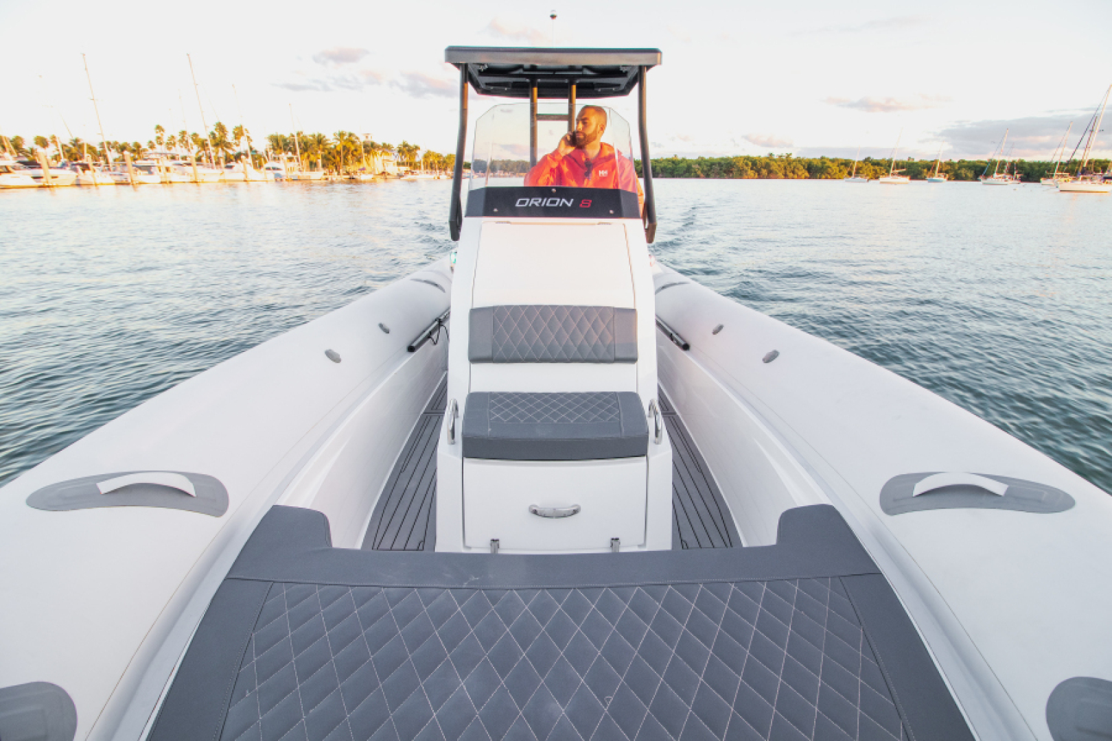 Loaded with impressive standard features, the Orion 8 includes Silvertex marine upholstery, large storage compartments, acrylic glove box with USB charging socket , twin flip-up seats, Hypalon tubes, hydraulic steering system, electrical plant with navigation lights and basic lighting, foldable table and 36L Igloo cooler, automatic bilge pumps, tempered glass windshield, swim platform, stainless steel swim ladder, telescopic cleats and stainless steel console and aft seat grab handles,