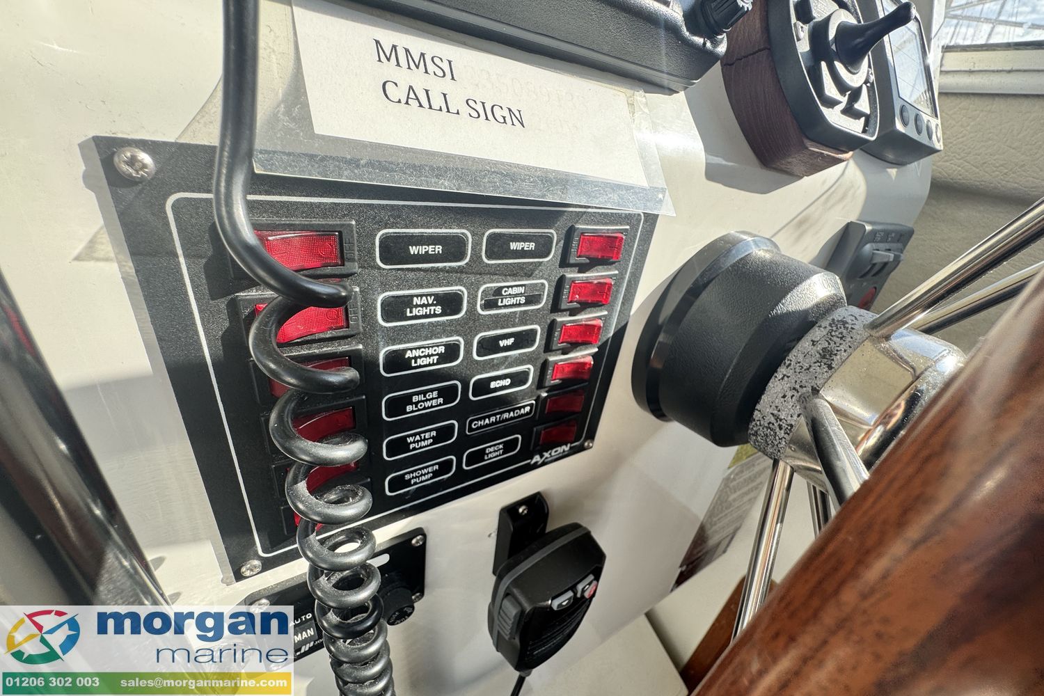 Electronics: Raymarine chart plotter. Raymarine Radar. Standard Horizon VHF radio. 12v USB socket. Raytheon Tridata display. Electric trim tabs. Bow thruster. Electric windscreen wipers. Compass. Nav lights. Interior lights. Anchor light. Cabin lights. Roof searchlight. Automatic and manual bilge pump. Engine gauges ( Oil pressure, temperature, Yanmar engine RPM, fuel and trim). Shore power connection with 2x connections on deck.