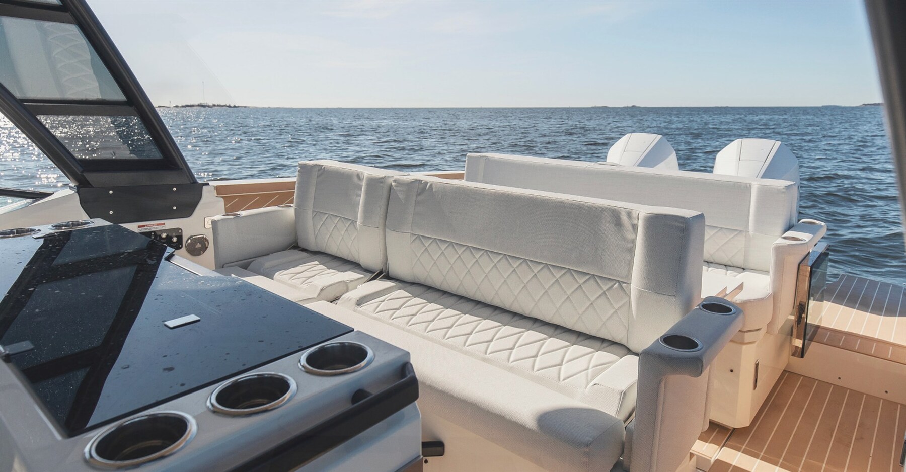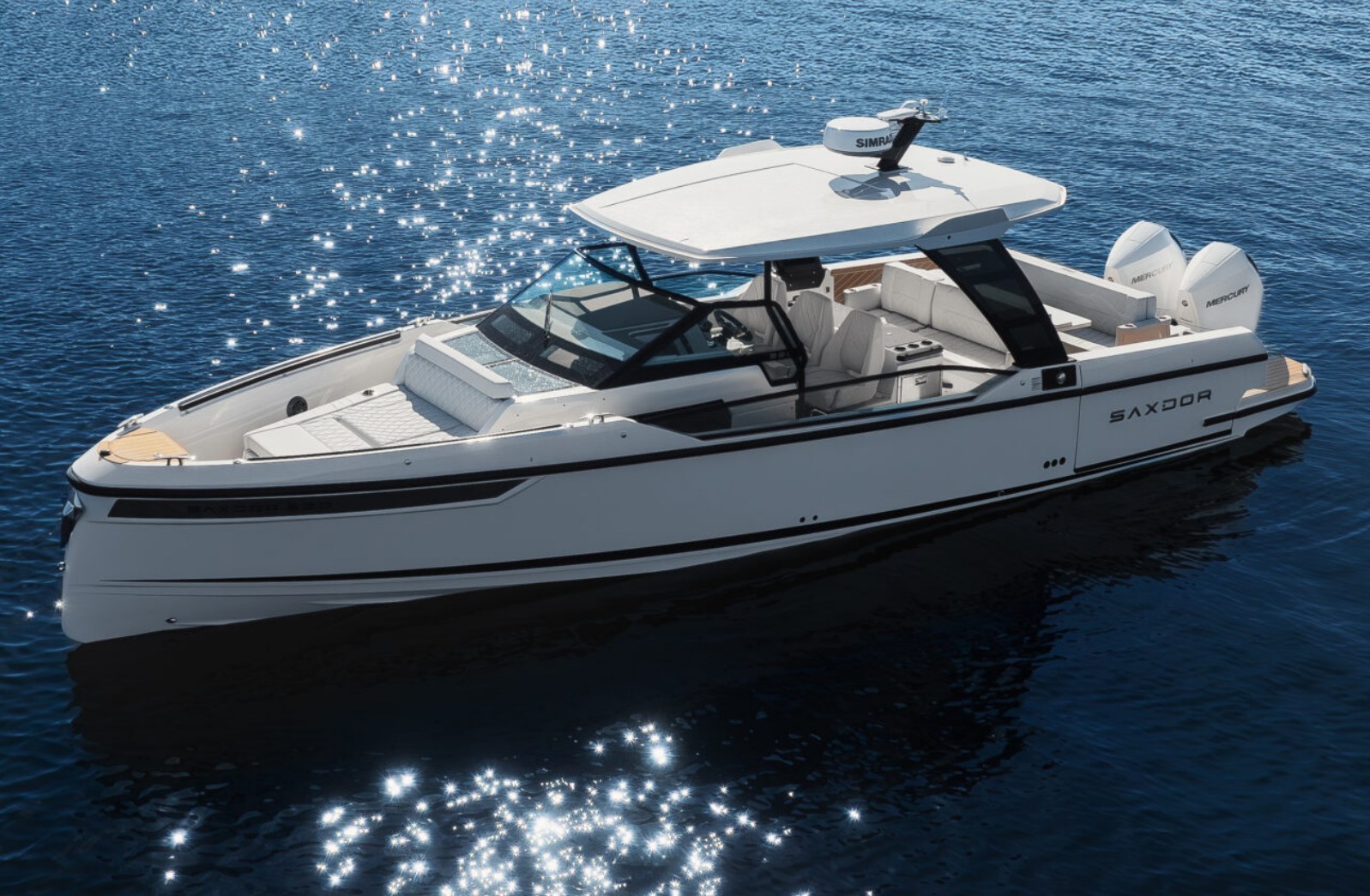 The Saxdor 320 GTO is the perfect balance of Italian design, American functionality, German quality and a French-style price. Equipped with a T-top and walk-around side walkways, it offers a refined design, powerful performance with outboard engines and an efficient and economical hull when sailing. All three versions (GTO, GTC and GT) share these distinctive features. The configuration with a single 300hp Mercury V8 engine allows it to reach a maximum speed of 40 knots, with a comfortable cruise around 30 knots. With two 300hp engines, on the other hand, the Saxdor 320 easily exceeds 50 knots, maintaining an optimal speed between 20 and 40 knots. The sundeck extended to the bow and the dinette that converts into a relaxation area offer ample space to lie down and enjoy the sun. In addition, with a simple gesture, the folding backrest transforms the front seats into comfortable benches facing forward to welcome guests. Contact us for more details.
