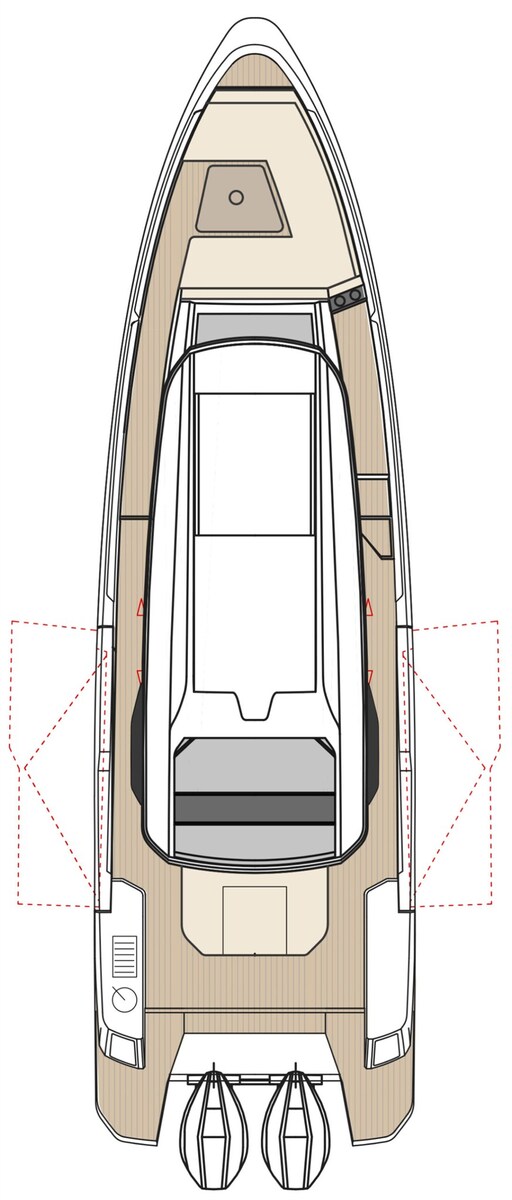 2 Motoralarm, Bilgealarm, Wechselstromgenerator, elektrische Trimmklappen, Hardtop, Waschbecken im Cockpit, Nachtbeleuchtung, Plattform, 3 automatische Bilgepumpe, Eingangstür, Seitentür, Badeleiter, Cockpittisch, Signalhorn.