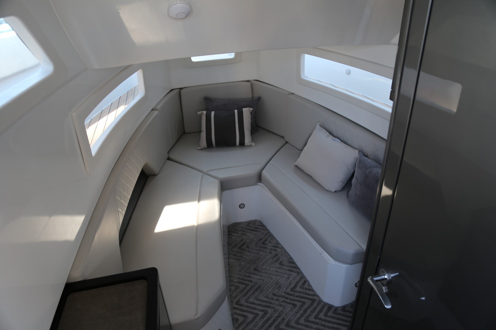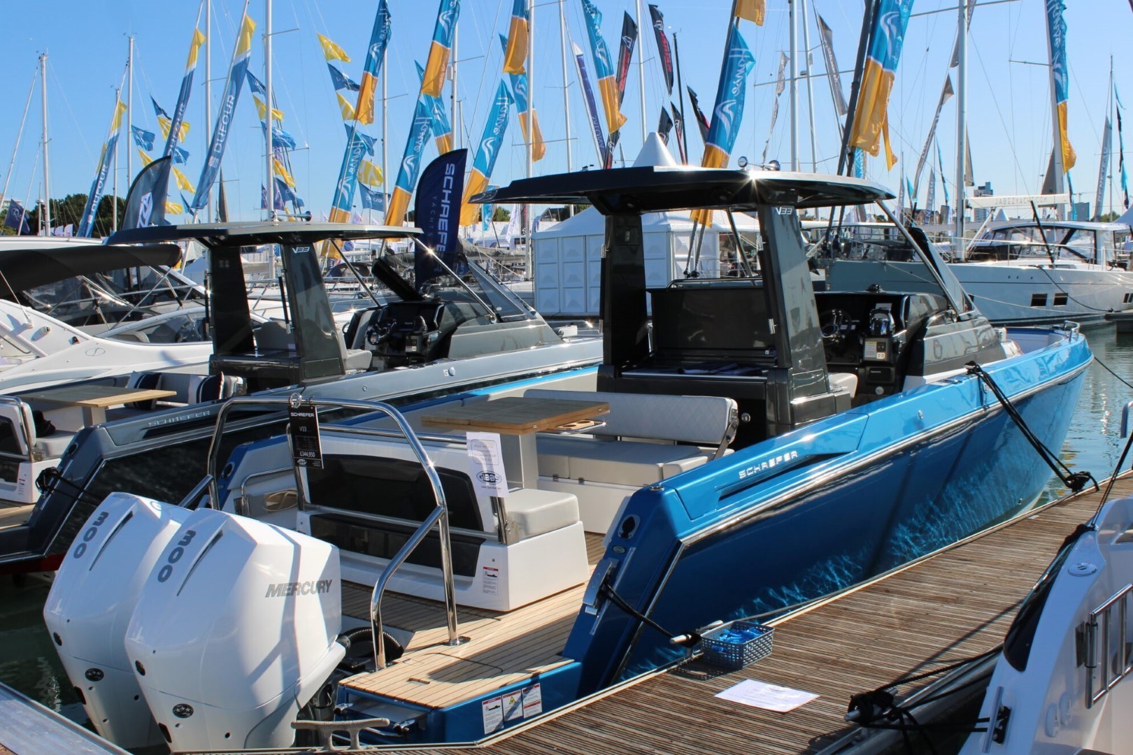 The new V33 is the latest offering from Schaefer with clever contemporary design features, this sporty walk-around boat coupled with class leading accommodation has the ability to thrill at sea and please at rest. This model has the awesome twin Mercury 300HP V8 Outboards with power steering providing outstanding performance. The V33 has spacious external areas with its open bow and ample aft cockpit, The surprisingly spacious cabin offers full height headroom and plenty of space for two people to spend the weekend comfortably. Enjoy life at sea with your family, fish with friends, play water sports or simply take an off-the-grid weekend in this amazing new model.