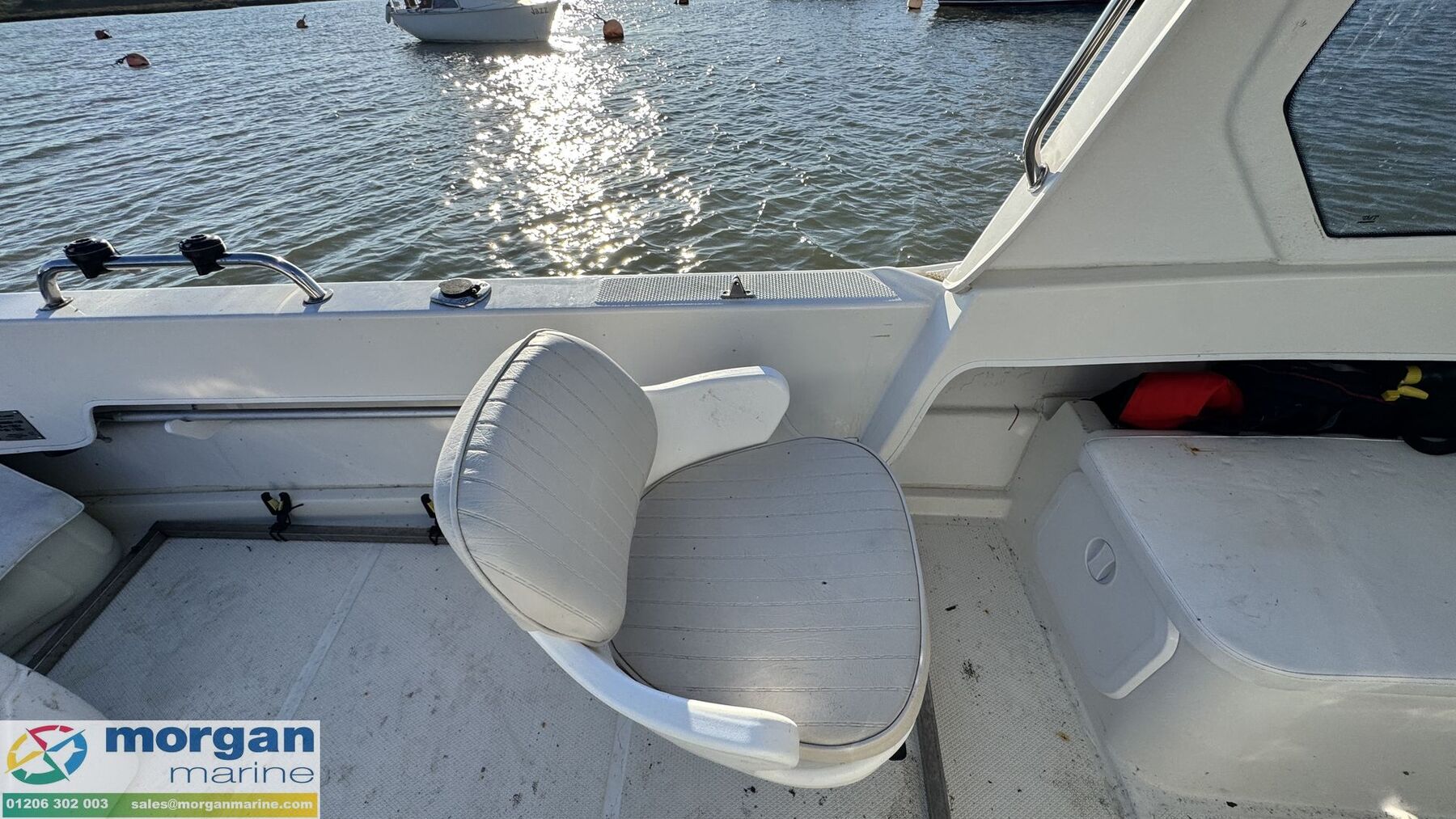 Cockpit: Adjustable and swivelling pilot and co-pilot bolster seats with backrest. Dash with steering wheel, electronics and engine controls. Port and starboard stern seating. Igloo cooler box.